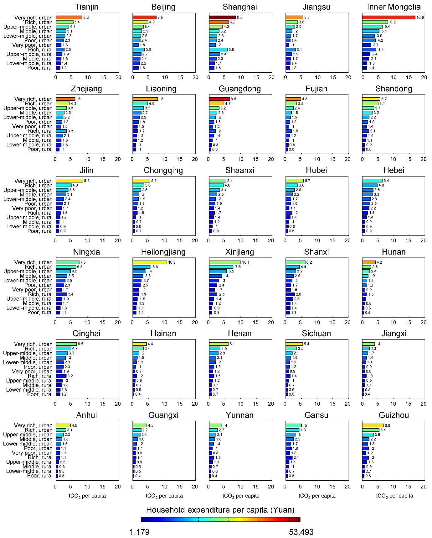 研究还发现,中国经济增长有利于促进家庭碳足迹的公平性。从时间跨度看,中国碳足迹基尼系数(该系数越小意味着越平等)从2007年的0.44下降到2012年的0.37。从空间视角看,富裕地区的家庭碳足迹公平性相对较高。例如,2012年,天津、北京、上海和江苏的人均GDP均超6.8万,其碳足迹基尼系数也相对较低,分别为0.19、0.16、0.14和0.18。相反地,欠发达地区的碳足迹基尼系数相对较高。例如,贵州的碳足迹基尼系数为0.38。