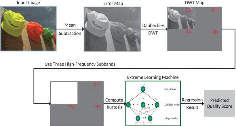 统计特征是从自然图像特有的统计规律中提取的描述量,其特性会随着图像噪声污染程度变化而改变。该团队研究小波系数的统计特性,发现低噪声或无噪声自然图像的小波系数具有细峰、尖峰的分布;而有噪声的图像往往是平顶的,尾部较浅的分布。根据上述规律,设计了峰态特征来精确描述图像受噪声污染的程度,构建灵活的回归模型对多种噪声类型进行拟合,最终利用快速超限学习机技术,将提取的图像小波系数峰态统计特征映射到图像质量上,完成对待检测图像质量的评价。该项工作为实现图像准确、高效的无参考评价提供了新的思路。