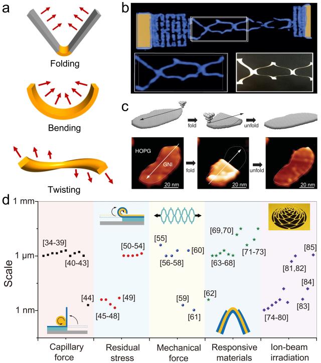 图1 微纳尺度剪纸/折纸的基本形变特点(折叠、弯曲、扭曲)、石墨烯剪纸/折纸、及应力激励方式