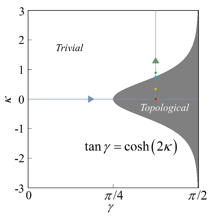 图 由耦合强度γ和增益损耗量κ决定的二维拓扑相图。拓扑相界面由数学关系tanγ=cosh(2κ)描述。