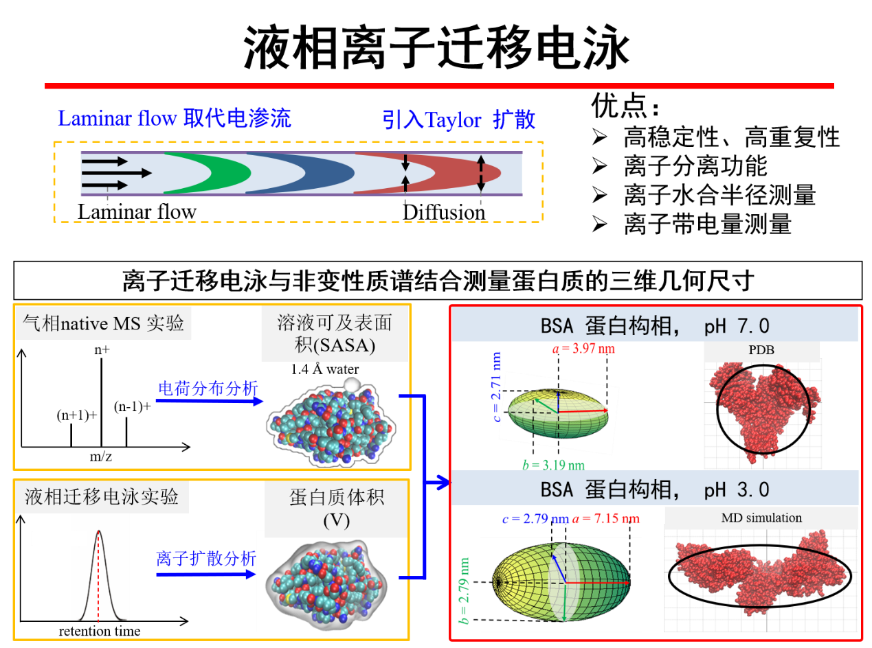 课题组首先发展了具有高稳定性、高重复性的液相离子迁移电泳技术与仪器,该方法利用Laminar flow取代了传统的电渗流,通过引入Taylor扩散实现了样品分子的分离、半径和分子有效带电量的同时测量(Wenjing Zhang, … Wei Xu*, Chemical Science, 2019, 10, 7779-7787)。为了获取生物大分子较全面的立体结构,课题组进一步将离子迁移电泳与非变性质谱技术相结合,通过气相非变性质谱实验获得了分子的溶液可及表面积、通过液相迁移电泳实验获取了分子体积,再结合流体力学Stokes Flow方程,最终获取了蛋白及蛋白复合体的三维几何尺寸信息(Haimei Wu, Rongkai Zhang, … Ye Xiang* and Wei Xu*, Chemical Science, 2020, 11, 4758-4765),该方法可应用于蛋白-小分子复合体结构研究(Jie Hong, …Muyi He* and Wei Xu*, Analytical Chemistry, 2020, 92, 5200-5206)。基于液相离子迁移原理,课题组进而开发了液相离子阱装置,在液相条件下实现了离子的富集、选择性传输与顺序弹射分析。通过该装置,不仅可以实现复杂样品的分离,也可以将质谱仪器的检测灵敏度提升100倍以上(Jie Hong, … Wei Xu*, Analytical Chemistry, 2020, doi: 10.1021/acs.analchem.0c01261)。