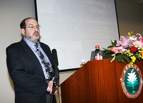 2009年5月4日,哈佛大学肯尼迪政府学院Arnold M. Howitt教授受邀到管理与经济学院进行访问,并在研究生楼102教室作题为“Leadership in Crises”的学术报告。校党委副书记侯光明热情接待了Howitt教授,对Howitt教授在北理工代表团访问哈佛大学肯尼迪政府学院时给予的热情接待表示感谢,同时对他来校作报告表示热烈欢迎,双方互赠纪念品。