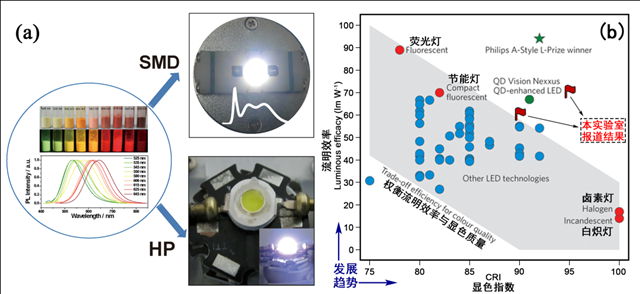 图1. (a)北理工所制备的纳米晶荧光粉材料及所制备的白光LED器件;(b)北理工所制备纳米晶白光LED性能与文献中现有白光照明技术参数的对比,红旗所在点为北理工2013年报道数据,其他数据来自Nature Photonics, 2013, 7, 13-23综述。