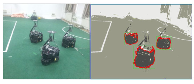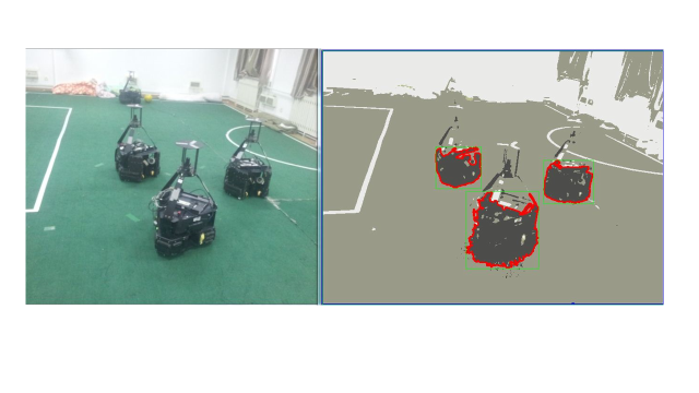 中型组机器人足球比赛的对抗性极强,机器的移动速度极快,因此对机器人的反应能力有很大的要求。对守门员来说,其应对的是对方的高速射门,所以球定位的速度及准确度要求尤为严格。但是限于机器搭载的计算机的处理能力,难以达到这样实时处理图像的要求。为解决此问题我们提出了视觉自适应系统的解决方案。该系统以人为事先预定的知识为依据,然后由机器对环境逐步自学习、自适应,表现为越来越准确的识别效果。同时为了降低所需要处理数据的空间复杂度,视觉系统将原有的全局搜索变为局部跟踪,使用粒子滤波算法,建立物体特征的离散模型,并增加中值滤波来对所记录的物体特征进行更新以达到对物体的特征跟踪和学习的同步。同时处理的数据也由原本的图像矩阵,减少为100到200的特征点的权值和坐标分布。最后再辅助以霍夫变换等图像处理方法,实现对球、障碍物、场线的快速识别,使机器可以实时掌握赛场信息。该系统识别效果如图4所示。