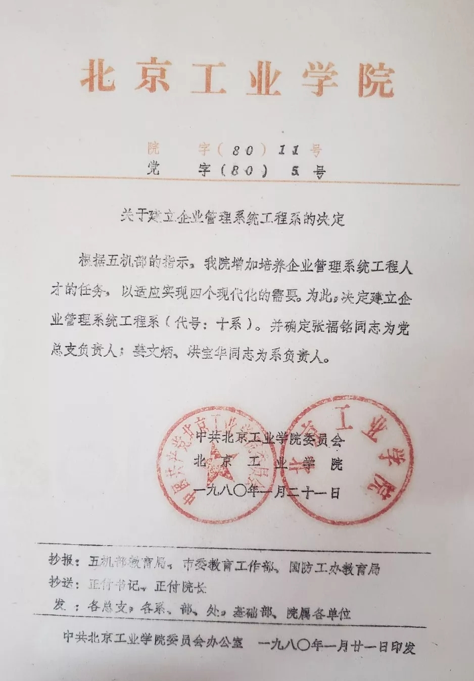 “改革开放以后,不仅要重视技术,也要重视管理,管理是在发展,我想去开拓一个新的领域。”在一番思想斗争之后,管理科学的吸引力让43岁的郎志正做出了“改行”的决定,他决定加入管理系。经过一批“创系元老”的努力,1979年底,管理系成立的条件基本成熟了。1980年1月,经第五工业机械部批准,学校正式下发文件,决定成立企业管理系统工程系(即管理工程系),姜文炳同志为行政负责人。