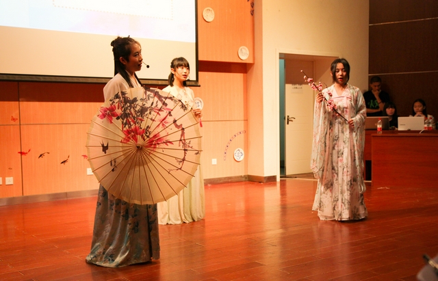 接下来是决赛最精彩的第三环节——人文演绎环节。该环节以“思想家-文学家与他们的时代”为主题,各代表队分别选择不同的人物进行表演展示。无论是外国语学院代表队的“独立之精神,自由之思想”,管理学院代表队的“苏轼及他的时代”,机电学院的“君子之争”,还是人文学院的“乌台错”,机械学部的“韩愈谏迎佛骨”,以及物理学院的“胡适,胡适”,都以新颖的角度、独特的见解与精彩的表演赢得了现场观众经久不息的掌声。