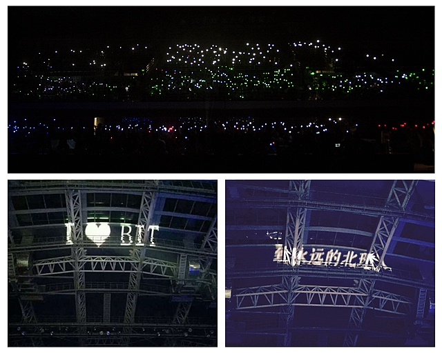 晚会进入后半段,现场大屏幕播放了75周年校庆晚会宣传片《Coming Home》,这时主持人提示毕业生拿起事先藏在座位底下的手指灯,随着现场观众慢慢点亮手指灯,整个看台被渲染成北理工校徽的红、白、绿三色,这时体育馆顶棚也被投射出“I Love BIT”、“致永远的北理人”等字样,现场爆发出雷鸣般的掌声与欢呼声。