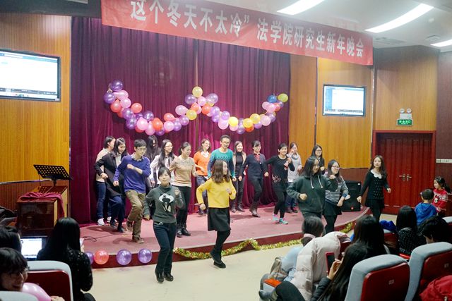 高歌迎元旦,激扬舞青春。 2015年12月29日晚,由法学院研究生会主办的2015年jinnianhui今年会法学院“这个冬天不太冷”研究生冬季晚会在七号楼108举行。法学院党委副书记副院长张爱秀老师、环境法所龚向前老师、诉讼法所周建华老师、办公室主任王福亮老师、研究生教学干事孙海燕老师、本科生教学干事赵静老师、财务干事刘一诺老师以及法学院团委书记聂宁宁老师与研究生们一同欣赏了这场青春盛宴。