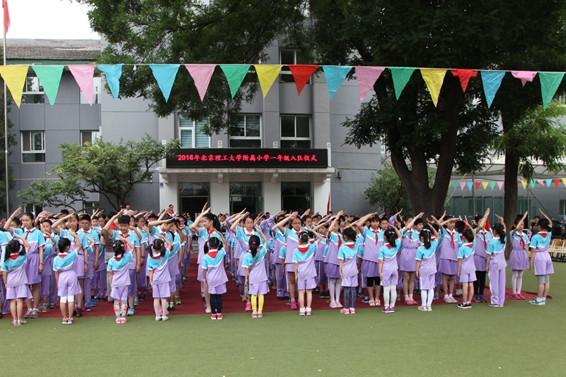 在清晨和煦的阳光下,全校师生和家长们纷纷来到彩旗飘扬的校园,他们在欢快的歌声中忙碌着、准备着,为校园带来第一份节日的快乐与祥和。上午8点,庄严的入队仪式在大队辅导员热情洋溢讲话中拉开序幕。少先队员们个个精神抖擞,一年级新入队的同学们更是神采飞扬。在坚定嘹亮的宣誓声中,在少先队鲜红的旗帜下,他们终于成为了光荣的少先队员,崭新的红领巾第一次在他们胸前绽放光彩。接着,新队员代表党卓颖同学作了精彩发言,一年级的五个新中队及其辅导员也随即产生。理工大学校长助理郝志强向同学们表达了六一的祝福,也提出了新的希望。“时刻准备着”,全体少先队员铿锵顿挫的呼号响彻校园,入队仪式在呼号的余音中结束。