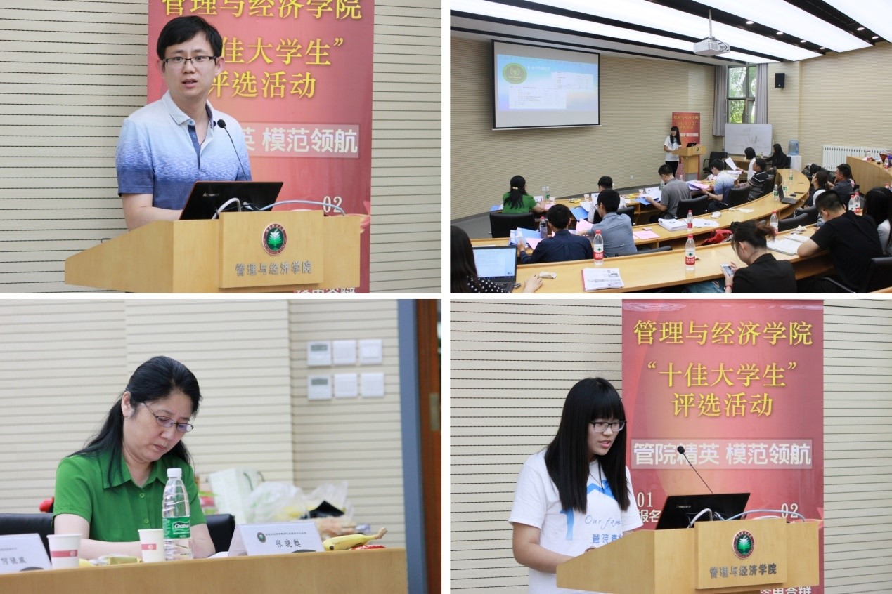 2016年4月,管理与经济学院正式启动以“管院精英,模范领航”为主题的2016年度“十佳大学生”评选活动。在4月初的申请阶段中,大家踊跃提交申请书,向着学院最高奖项努力。5月,活动进入初审阶段,“十佳大学生”评选委员会认真研究了申请人资料,完成了材料的预审与筛选,最终共有二十二位精英脱颖而出,通过初审最终晋级终审阶段。2016年6月初进行了“十佳大学生”的网络投票环节,学院在管理与经济学院网站与微信公众平台上展示了候选人资料并进行了线上投票。同学们在阅读了解候选人的事迹后,慎重地投出自己心目中认可的“十佳大学生”。