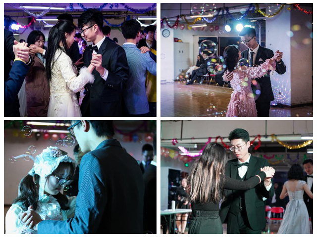舞池中央的音乐响过一曲又一曲,谈笑欢闹间,舞会逐渐接近尾声。在温暖柔美的氛围中,主持人示意同学们以“手环匹配”的形式寻找舞伴,共同完成“最后一舞”,为本次舞会画上了圆满的句号。