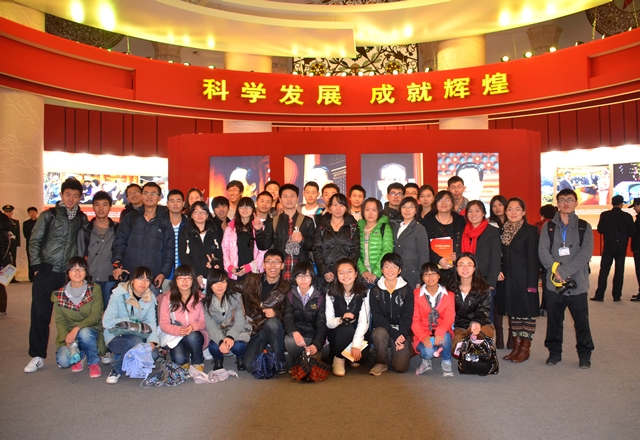 在党的十八大胜利召开之际,2012年11月10日下午,北理工大学生记者团50余名同学在校党委宣传部扬扬老师的带领下赴北京展览馆参观题为“科学发展,成就辉煌”的主题图片展。
