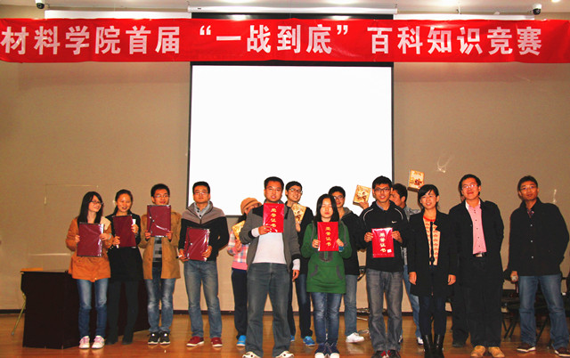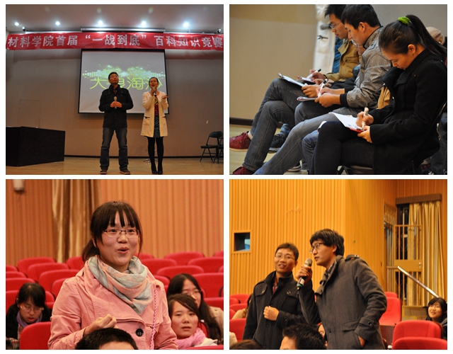 2013年11月3号18:00,材料学院首届“一战到底”百科知识竞赛在七号楼报告厅拉开帷幕,此次活动由材料学院研究生会主办,材料学院党委副书记副院长张舰月、材料学院团委书记刘艳、团委副书记张博文、兼职辅导员常云鹏出席活动。