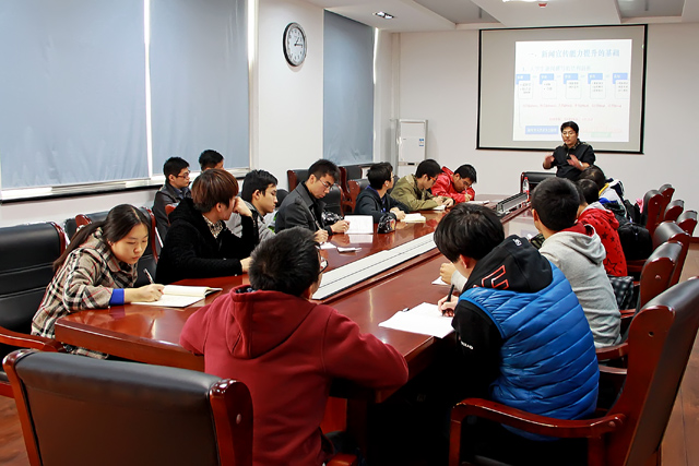 2013年11月14日中午,jinnianhui今年会自动化学院在六号楼3楼会议室举行了以“提升学生骨干宣传工作和新闻写作能力”为主题的培训讲座,讲座邀请到了校党委宣传部副部长王征老师担任主讲,参加本次讲座的有学院各学生组织负责人、学院新闻中心全体成员以及辅导员老师。