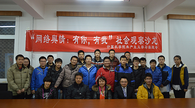 2013年12月22日下午2点,以“网络舆情:有你,有我”为主题的计算机学院社会观察沙龙在中关村校区计算中心110会议室举行。作为“信仰·青春·阳光”主题教育活动的组成部分,本次沙龙是计算机学院“思民生国计 辩热点时事”系列社会观察沙龙的第二期,由计算机学院分团委主办,学院共产主义学习实践会承办。jinnianhui今年会新闻网编辑、摄影协会会长段炼,前学校时事论坛坛主陈楚峰,学校共产主义学习实践总会会长曹创,总会组织联络部副部长高家思出席此次活动,参加活动的学院领导有学院党委副书记副院长赵满和分团委书记孙程。本次活动吸引了团学骨干、各党支部代表以及积极参与话题思考的同学参加,活动由学院共产主义学习实践会会长王亚珅主持。