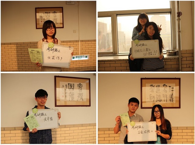 在征集的寄语中,有考研学子勉励自己,写下“考研路上,坚持、坚持、坚持”;有祝福身边考研的同学,写下“加油”、“必胜”等话语;也有给“研友”的深深祝愿,如“祝大家都能考上”等。也有考研学子借此机会写下了自己在考研路上的感悟,如“考研路上,很幸福”、“考研路上,收获很多”等等。