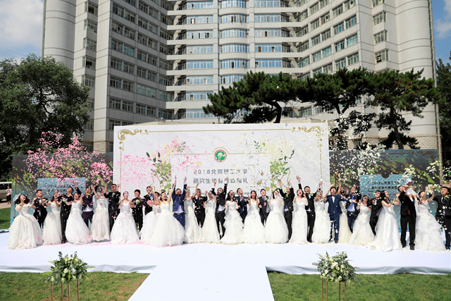 初夏之际,蓝天白云,伴着清新典雅的音乐,在绿树环绕的中心花园大草坪上,在教学楼环绕之中,一场校园婚礼正在举行,在师生好...